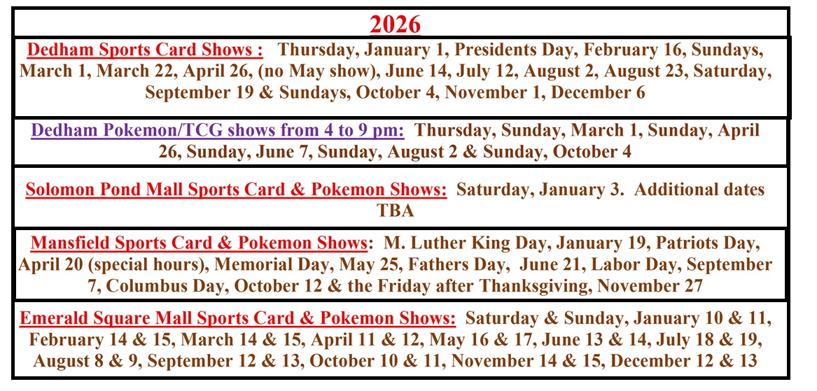 Buy-Sell-Trade Cards & Collectibles/Memorabilia of all sports, old & new cards, graded cards, sets, wax boxes, game used items, Pokemon & other TCG cards, autographs, figuirines/McFarlands, card supplies at GREAT PRICES. A professionally run card show since 1991 !