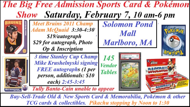 Show is on for Saturday. Local forecast is for 1 to 2 inches of snow. Our Solomon Pond card show starts in front of the Boston's Premier Signature store & ends at the Sears/right end of mall with the autogarph guests