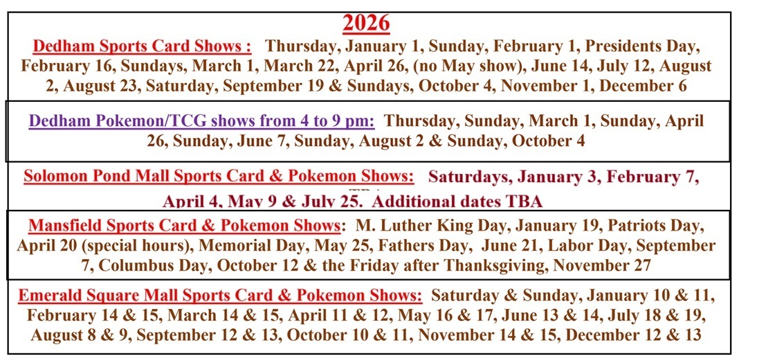 Buy-Sell-Trade Cards & Collectibles/Memorabilia of all sports, old & new cards, graded cards, sets, wax boxes, game used items, Pokemon & other TCG cards, autographs, figuirines/McFarlands, card supplies at GREAT PRICES. A professionally run card show since 1991 !